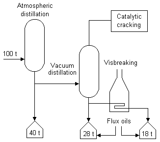 Refineries have been adapted to intensify the production of light compounds in processes like that shown in Figure 4. For instance, visbreaking units (intermediate temperature, high pressure cracking) are being added to existing processes. Visbreaking produces additional volatile materials and a "cracked" residual material. The volatiles so produced may be used either to increase the yield of light products or to replace gas oil as a "cutter" stock for adjusting the viscosity characteristics of heavy oil by blending with the residual fractions.