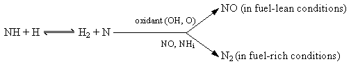 The subsequent oxidation of the amine species is a rapid process which occurs via two routes, depending on the availability of oxidant in the combustion environment (Toof (1986)) :