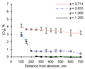 Subsequently, concentrations of oxygen decrease further as combustion progresses along the furnace. The final amounts are reached at 400 mm from the atomiser nozzle.