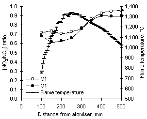 An alternative hypothesis can be formulated. Irrespective of the axial flame temperature profile, the furnace walls are at a constant temperature of 900 °C. Combustion gases near the furnace walls will be at a temperature which is more favourable for the formation of HO2 and, consequently, NO2. Also, oxygen needed to form HO2 radicals is still available (albeit in low concentrations) up to 500 mm from the atomiser. NO2 thus formed can subsequently diffuse back into the furnace central axis, giving place to the concentrations measured. Given the inverse relationship of HO2 radicals with temperature, lower concentrations of NO2 would be expected at higher furnace wall temperatures. However, the exhaust concentrations of NO2 increased from 900 to 1,100 °C for fuel M1, whereas a very minor decrease was obtained from fuel G1.