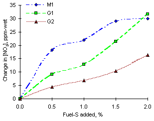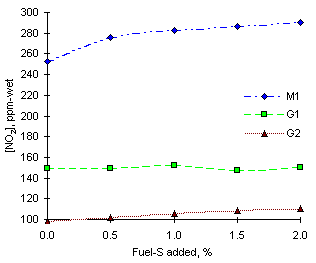 = 1.000 from experiments of sulphur addition from the fuels investigatedEmissions from fuel G1 increased by 31.7 ppm-wet (ie 46.4 % of the emissions without addition of S) whereas G2 produced the smallest nominal increases of NO2 (16.3 ppm-wet, ie 52 %). The extent of the increase followed the order of nitrogen content of the fuels. The nitrogen content of fuel M1 is 0.32 %, whereas it is 0.13 % for fuel G1 and 0.06 % for fuel G2.
