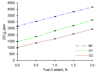 = 0.833As expected, the measured concentrations of SO2 increase with the injection of SO2-gas to the combustion system. Concentrations of SO2 rose by an average 472 ppm with every 0.5 % fuel-S increase to Orimulsion. The increases were lower with the heavy gas oils investigated, between 316 and 363 ppm for each 0.5 % fuel-S increase, due to smaller additions of SO2 being required to meet the percentage of fuel-S.